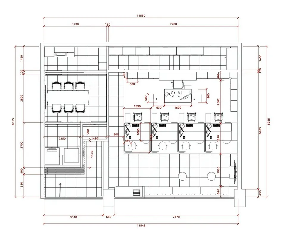 고객 대기 공간, 상담실, 직원 사무 영역을